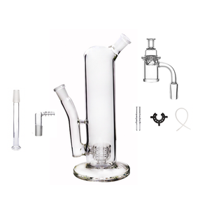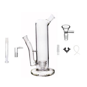 This is our latest 14mm water pipe glass bong rig kit. It features the built in Matrix perc, stable design, 14mm female joints, high airflow. This bong is about 9 inch height with 4inch wider base.